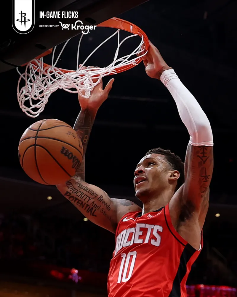 火箭官方分享贾巴里-史密斯双手暴扣势大力沉的精彩瞬间。